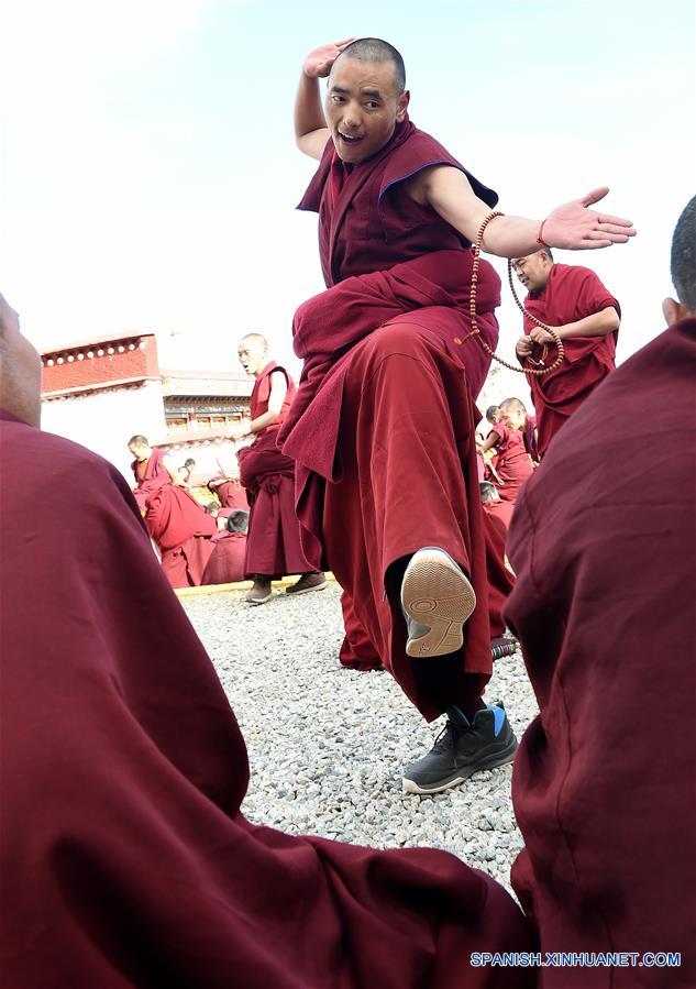 Imagen del 2 de enero de 2017 de monjes debatiendo sobre sutras del budismo timetano durante un ensablaje de dharma en la lamasería Jiangsi en el condado de Qushui de Lhasa, capital de la región autónoma del Tíbet, en el suroeste de China. Más de 200 monjes de la lamasería y otros templos participaron el lunes en el ensablaje de dharma. (Xinhua/Chogo)