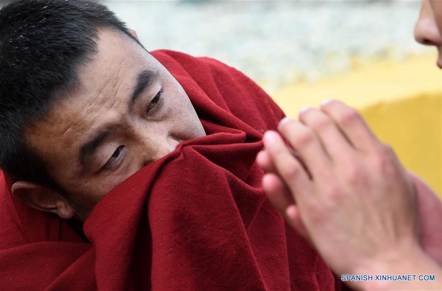 Imagen del 2 de enero de 2017 de un monje escuchando sutras durante un ensablaje de dharma en la lamasería Jiangsi en el condado de Qushui de Lhasa, capital de la región autónoma del Tíbet, en el suroeste de China. Más de 200 monjes de la lamasería y otros templos participaron el lunes en el ensablaje de dharma. (Xinhua/Chogo)
