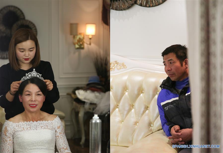 Imagen combinada tomada del 30 de diciembre de 2016 de Yang Yingzhi maquillándose para las fotografías de boda (i), y Huang Jingwen observando a su esposa en un estudio fotográfico (d), en Beijing, capital de China. Huang Jingwen y Yang Yingzhi son de la Prefectura Autónoma Honghe Hani y Yi de la provincia de Yunnan, en el suroeste de China y actualmente trabajan en un proyecto de costrucción en Beijing. Como un regalo de A?o Nuevo, un estudio fotográfico en Beijing tomó fotografías gratis para la pareja que celebrará el 30 aniversario de su matrimonio en 2017. (Xinhua/Cheng Tingting)