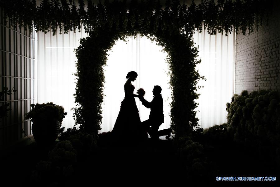 Imagen del 30 de diciembre de 2016 de Huang Jingwen (d) y Yang Yingzhi posando para las fotografías de boda en un estudio fotográfico, en Beijing, capital de China. Huang Jingwen y Yang Yingzhi son de la Prefectura Autónoma Honghe Hani y Yi de la provincia de Yunnan, en el suroeste de China y actualmente trabajan en un proyecto de costrucción en Beijing. Como un regalo de A?o Nuevo, un estudio fotográfico en Beijing tomó fotografías gratis para la pareja que celebrará el 30 aniversario de su matrimonio en 2017. (Xinhua/Zhang Cheng)