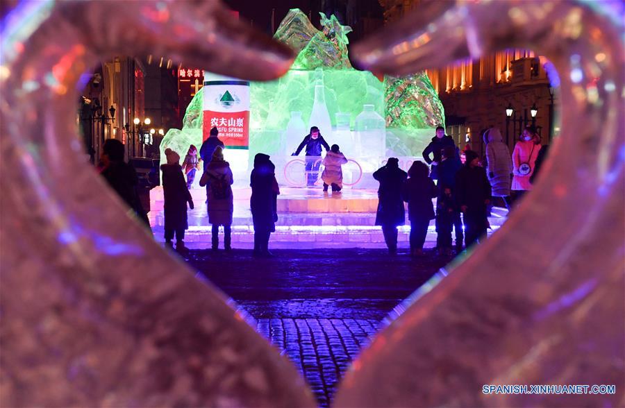 Turistas observan las esculturas de hielo en la Avenida Central de Harbin, en Harbin, capital de la provincia de Heilongjiang, en el noreste de China, el 3 de enero de 2017. Harbin es apodada la "ciudad de hielo" de China en el noreste lejano. (Xinhua/Wang Song)