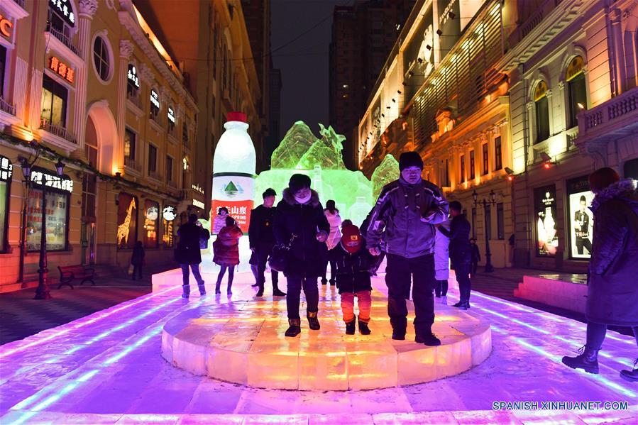 Turistas observan las esculturas de hielo en la Avenida Central de Harbin, en Harbin, capital de la provincia de Heilongjiang, en el noreste de China, el 3 de enero de 2017. Harbin es apodada la "ciudad de hielo" de China en el noreste lejano. (Xinhua/Wang Song)