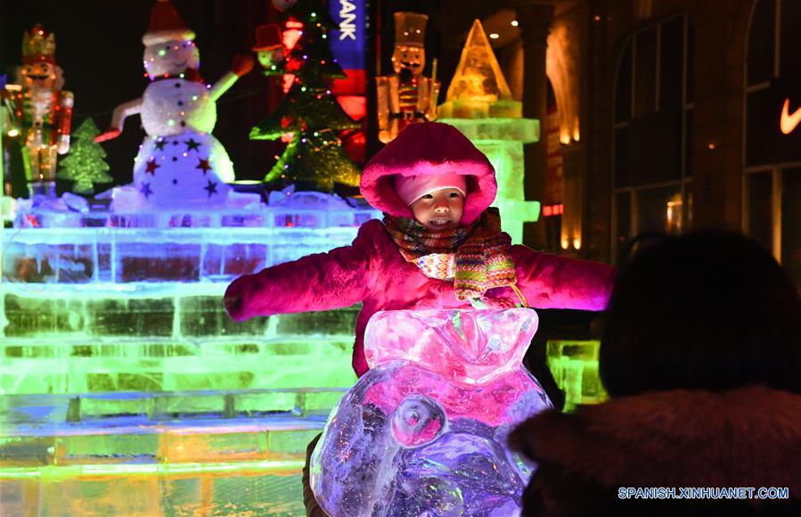Una ni?a posa con las esculturas de hielo en la Avenida Central de Harbin, en Harbin, capital de la provincia de Heilongjiang, en el noreste de China, el 3 de enero de 2017. Harbin es apodada la "ciudad de hielo" de China en el noreste lejano. (Xinhua/Wang Song)