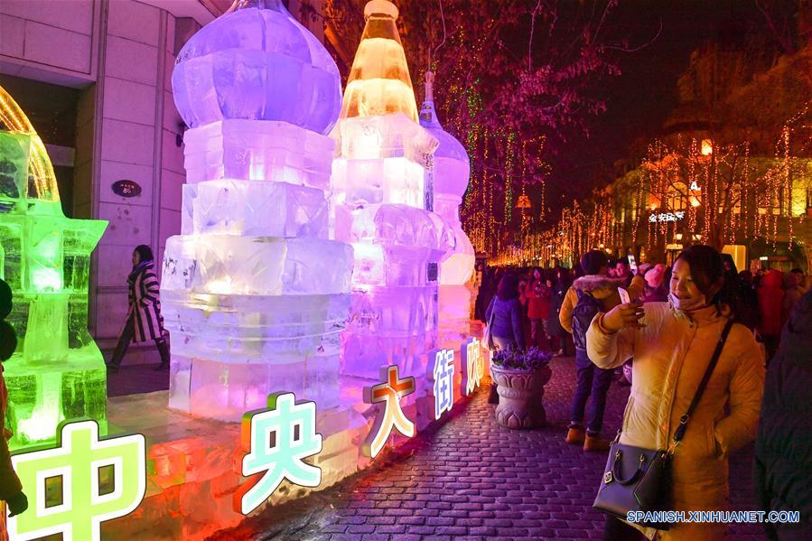 Turistas observan las esculturas de hielo en la Avenida Central de Harbin, en Harbin, capital de la provincia de Heilongjiang, en el noreste de China, el 3 de enero de 2017. Harbin es apodada la "ciudad de hielo" de China en el noreste lejano. (Xinhua/Wang Song)