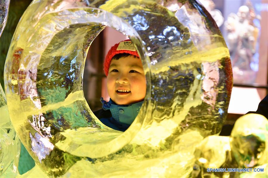 HEILONGJIANG, enero 3, 2017 (Xinhua) -- Un ni?o observa las esculturas de hielo en la Avenida Central de Harbin, en Harbin, capital de la provincia de Heilongjiang, en el noreste de China, el 3 de enero de 2017. Harbin es apodada la "ciudad de hielo" de China en el noreste lejano. (Xinhua/Wang Song)