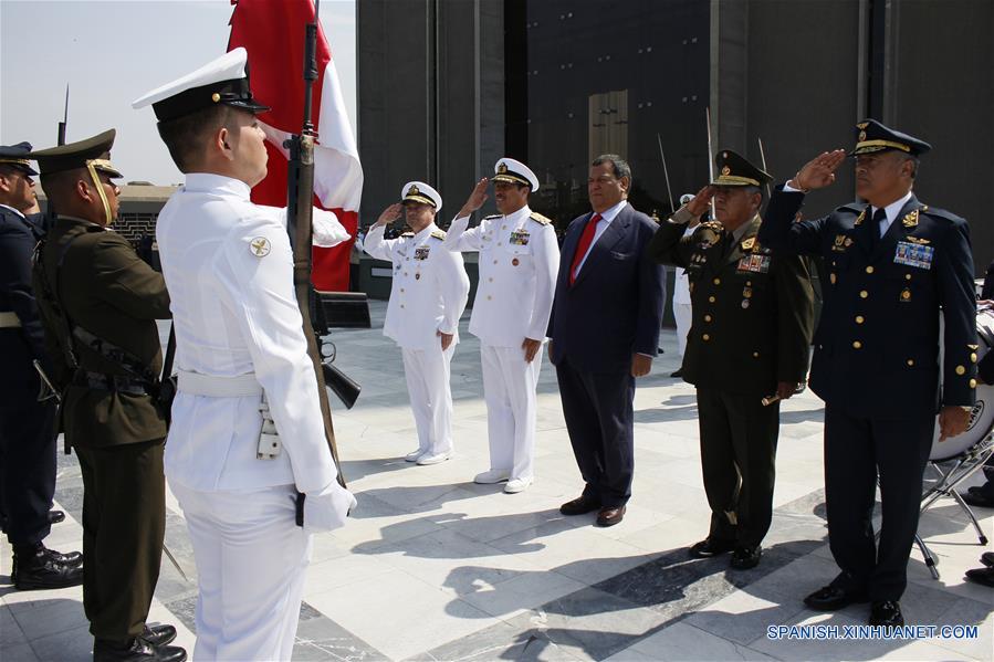 El ministro de Defensa de Perú, Jorge Nieto (3-d), saluda a la bandera nacional peruana durante la ceremonia de despedida de los integrantes de los "Cascos Azules Peruanos" que conforman el Segundo Contingente de la Compa?ía de Ingeniería Perú que forman parte la Misión Multidimensional Integrada de Estabilización de las Naciones Unidas en la República Centroafricana (MINUSCA) llevada a cabo en el Cuartel General del Ejército, en la ciudad de Lima, Perú, el 3 de enero de 2017. El Segundo Contingente de la Compa?ía de Ingeniería Perú, denominado "Cascos Azules Peruanos", está conformado por 205 efectivos militares, 121 miembros del Ejército, 58 de la Marina de Guerra y 26 de la Fuerza Aérea, y la tarea principal a cumplir será la construcción y mantenimiento de aeródromos en la República Centroafricana, de acuerdo con información de la prensa local. (Xinhua/Luis Camacho)