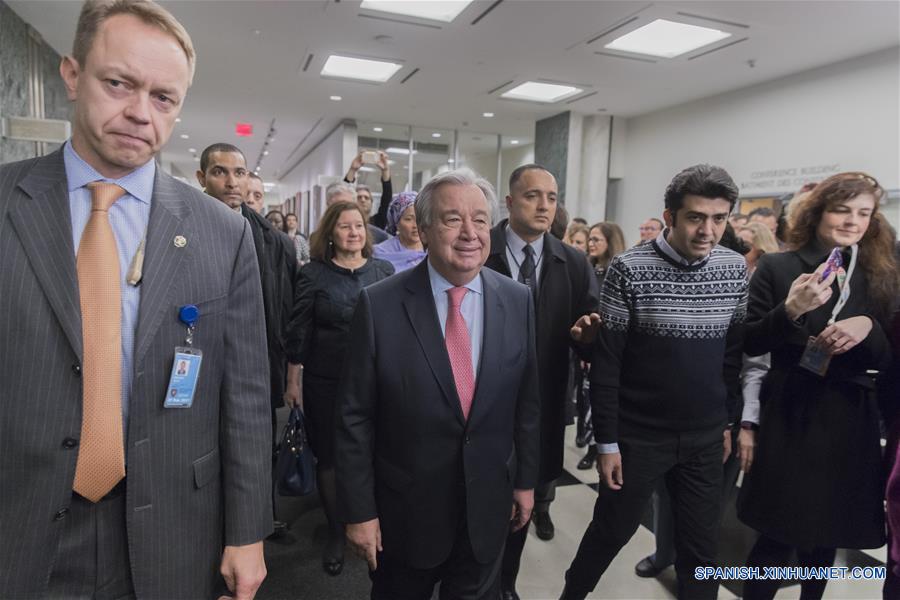 El secretario general de la Organización de las Naciones Unidas (ONU), Antonio Guterres (c), saluda a los miembros de personal de la ONU en el primer día de trabajo del 2017, en la sede de la ONU en Nueva York, Estados Unidos de América, el 3 de enero de 2017. El secretario general de la ONU, António Guterres, dijo el martes al personal del organismo mundial que la ONU requiere su esfuerzo colectivo para hacer cambios encaminados a alcanzar los objetivos de la organización de paz, seguridad y desarrollo. (Xinhua/Li Muzi)