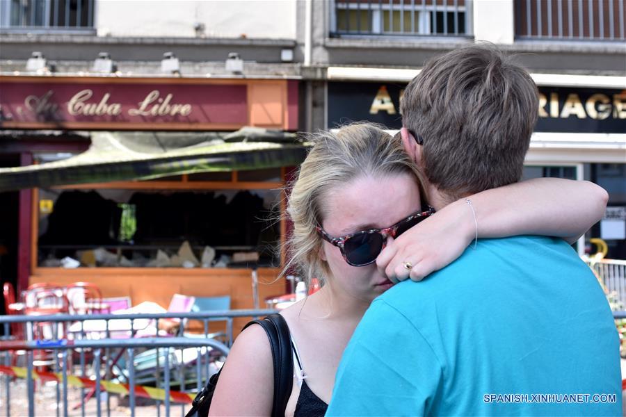 Una mujer estaba a pie apoyada por su compa?ero fuera de un bar donde un incendio causó muerte a 13 personas en Francia el 6 de agosto. (Xinhua/Li Genxing)