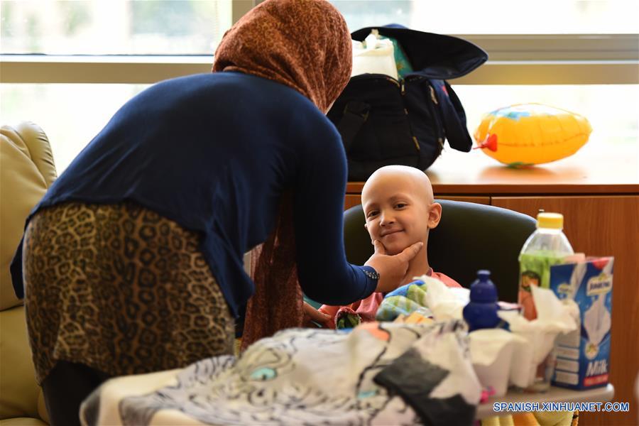 Una madre cuidaba a su ni?o que estaba recibiendo tratamiento de cáncer en un hospital en Cairo, Egipto el 3 de julio. (Xinhua)