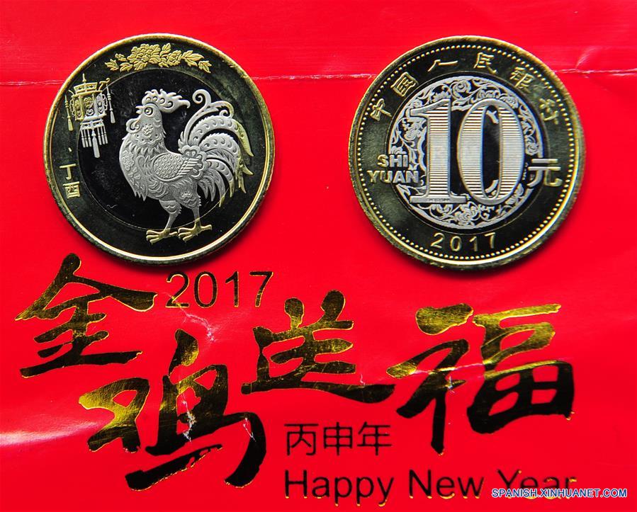 JIANGSU, enero 4, 2017 (Xinhua) -- Las monedas conmemorativas por el A?o del Gallo son exhibidas en la ciudad de Wuxi, provincia de Jiangsu, en el este de China, el 4 de enero de 2017. El Banco Popular de China emitió el miércoles monedas conmemorativas de 10 yuanes. (Xinhua/Huan Yueliang)