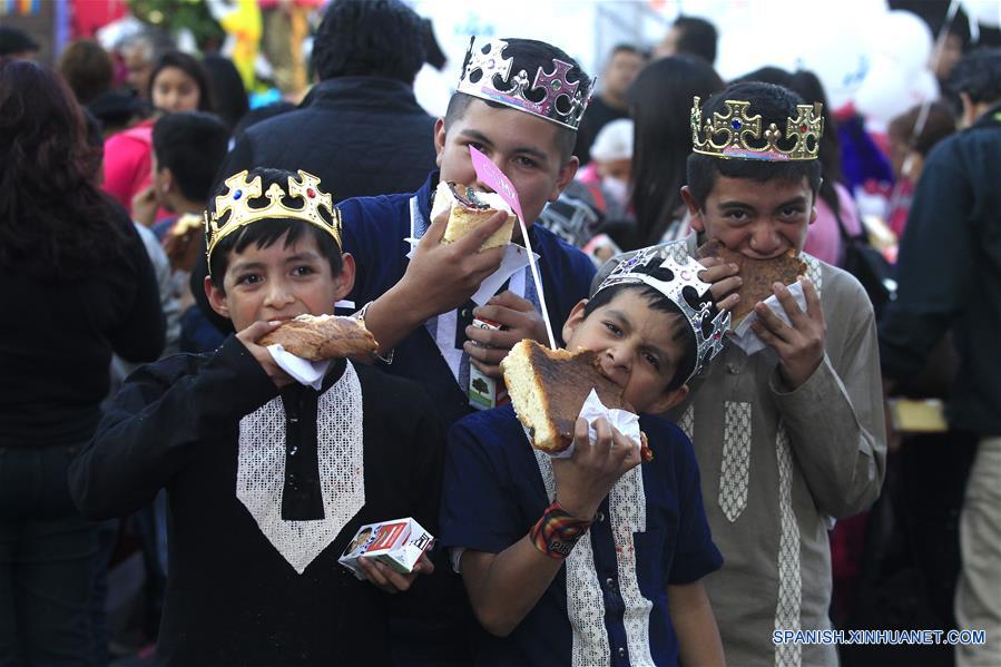 CIUDAD DE MEXICO, enero 5, 2017 (Xinhua) -- Ni?os comen un pedazo de la Mega Rosca de Reyes, en el Zócalo de la Ciudad de México, capital de México, el 5 de enero de 2017. De acuerdo con información de la prensa local, la rosca fue elaborada por artesanos de la Cámara de la Industria Panificadora con más de 1,400 metros de longitud, y será repartida en más de 200,000 rebanadas aproximadamente. (Xinhua/Str)