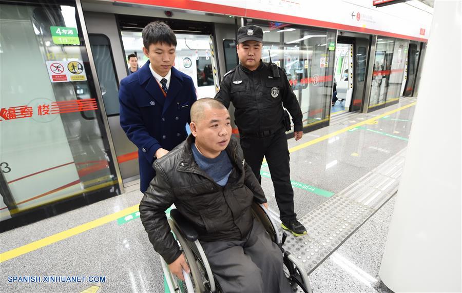 FUJIAN, enero 6, 2017 (Xinhua) -- Empleados ayudan a un pasajero discapacitado en la Línea 1 del Metro, en Fuzhou, capital de la provincia de Fujian, en el sureste de China, el 6 de enero de 2017. Fujian abrió el viernes su primera línea del metro en su ciudad capital de Fuzhou. (Xinhua/Lin Shanchuan)