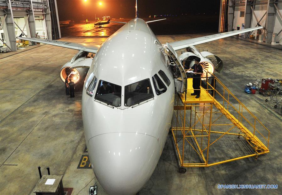 HAINAN, enero 11, 2017 (Xinhua) -- Técnicos examinan y le dan mantenimiento a una aeronave en una base de mantenimiento de China Southern Airlines en Haikou, capital de la provincia de Hainan, en el sur de China, el 10 de enero de 2017. China Southern Airlines inspecciona y limpia los aviones para enfrentar la próxima fiebre de viaje por el Festival de Primavera. (Xinhua/Chu Hongyu)