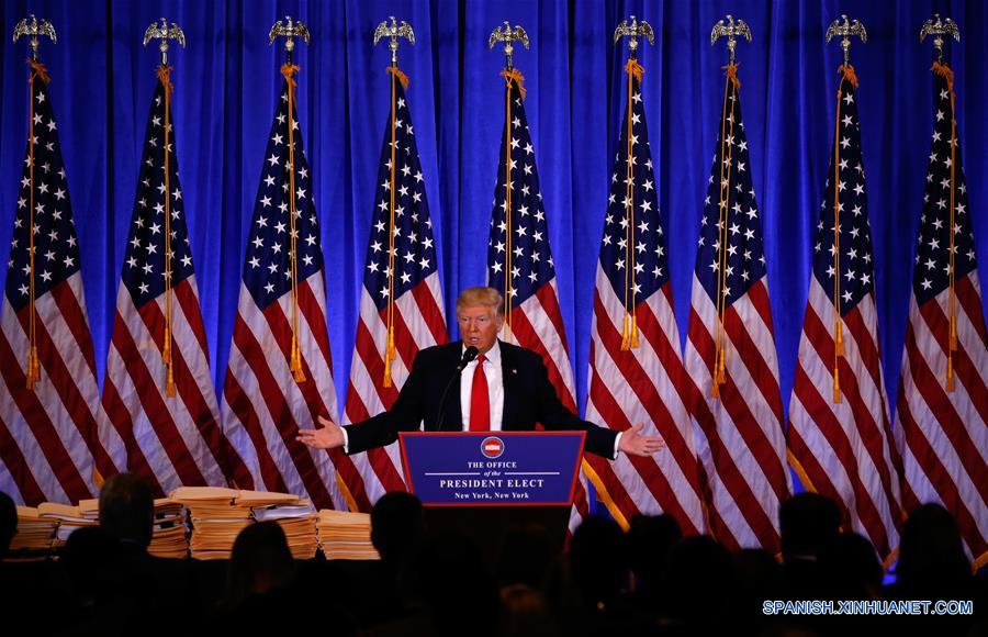 El presidente electo de Estados Unidos de América, Donald Trump, sostiene una conferencia de prensa, en Nueva York, Estados Unidos de América, el 11 de enero de 2017. El presidente electo estadounidense, Donald Trump, se reunió con representantes de los medios de comunicación para su primera conferencia de prensa desde las elecciones presidenciales. (Xinhua/Gary Hershorn/ZUMAPRESS)