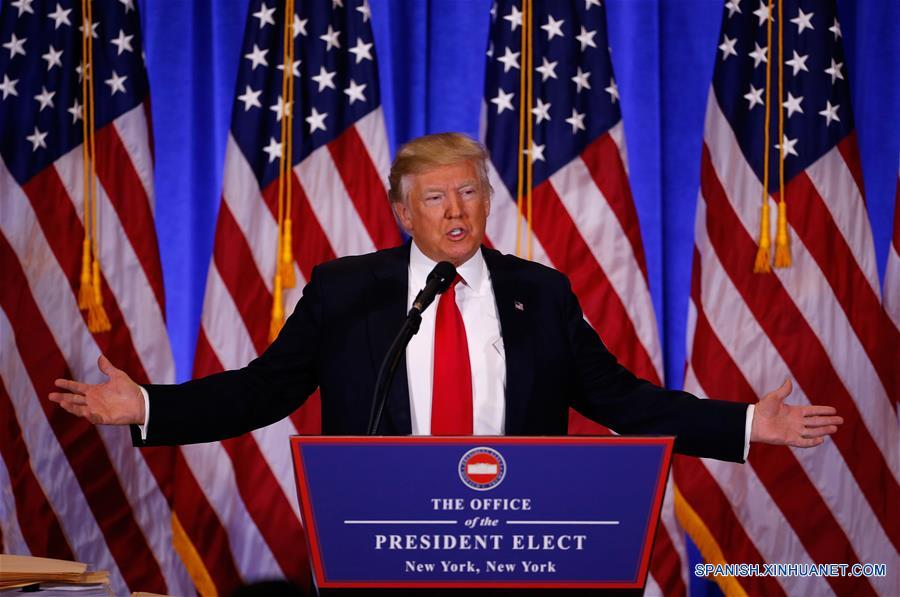El presidente electo de Estados Unidos de América, Donald Trump, sostiene una conferencia de prensa, en Nueva York, Estados Unidos de América, el 11 de enero de 2017. El presidente electo estadounidense, Donald Trump, se reunió con representantes de los medios de comunicación para su primera conferencia de prensa desde las elecciones presidenciales. (Xinhua/Gary Hershorn/ZUMAPRESS)