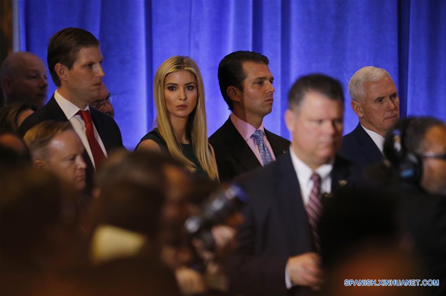 (De izq. a der.) Los hijos del presidente electo de Estados Unidos de América, Donald Trump, Eric Trump, Ivanka Trump y Donald Trump Jr., permanecen junto al vicepresidente electo estadounidense, Mike Pence, durante una conferencia de prensa sostenida por el presidente electo, en Nueva York, Estados Unidos de América, el 11 de enero de 2017. El presidente electo estadounidense, Donald Trump, se reunió con representantes de los medios de comunicación para su primera conferencia de prensa desde las elecciones presidenciales. (Xinhua/Gary Hershorn/ZUMAPRESS)