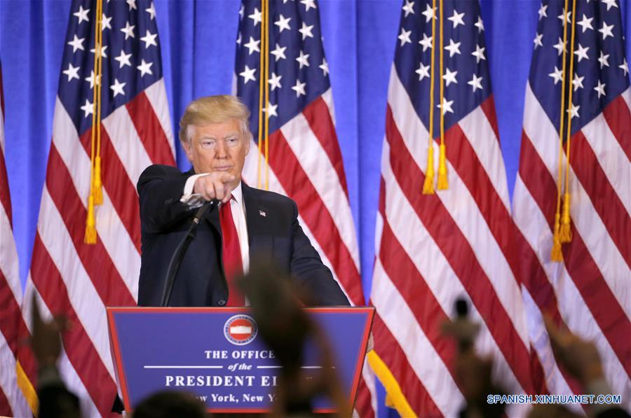 El presidente electo de Estados Unidos de América, Donald Trump, gesticula durante una conferencia de prensa, en Nueva York, Estados Unidos de América, el 11 de enero de 2017. El presidente electo estadounidense, Donald Trump, se reunió con representantes de los medios de comunicación para su primera conferencia de prensa desde las elecciones presidenciales. (Xinhua/Gary Hershorn)