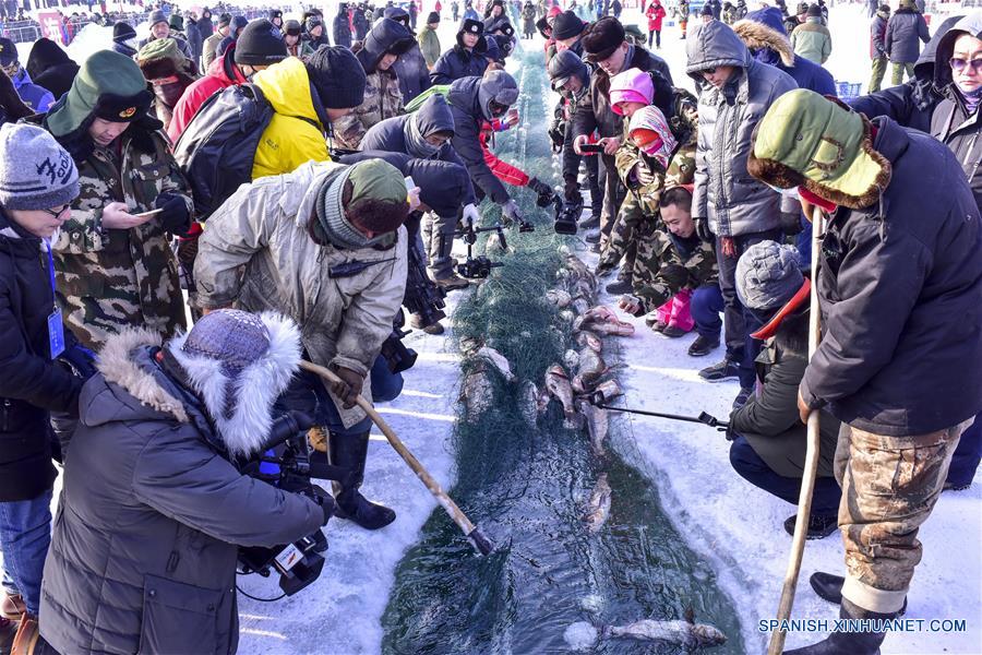 XINJIANG, enero 14, 2017 (Xinhua) -- Pescadores se reúnen en torno a una red en el Lago Ulunggur en el condado de Fuhai, en la Región Autónoma Uygur de Xinjiang, en el noroeste de China, el 14 de enero de 2017. (Xinhua/Jiang Wenyao)