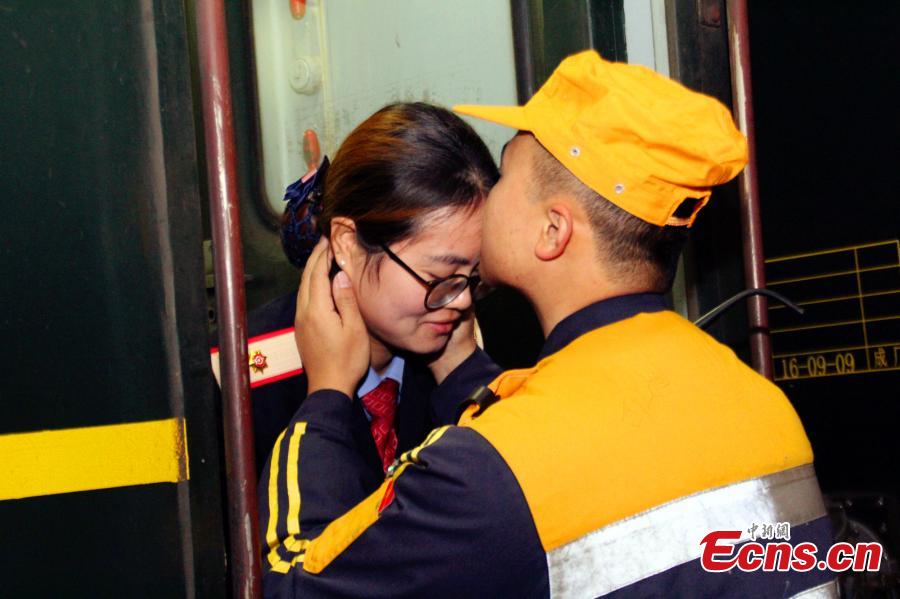 Bai Jiangxu abraza a su esposa Zeng Cheng en la estación Zhijiang en la ciudad de Zhijiang, provincia de Hubei, el 12 de enero de 2017. Bai trabaja en la estación mientras su esposa es conductora del tren k935 que realiza la ruta entre Xiangyang en Hubei y Guangzhou en Guangdong, y para sólo durante tres minutos en la estación. Bai y Zeng se ven durante tres minutos cada ocho días, pero durante la temporada del Festival de Primavera, la pareja, ambos nacidos en la década de los 90, no tiene tiempo ni incluso para esos tres minutos. (Foto: Servicio de Noticias de China / Dai Qiaosheng)