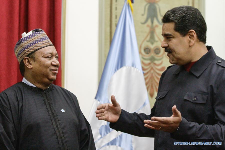 El presidente venezolano, Nicolás Maduro (d), conversa con el secretario general de la Organización de Países Exportadores de Petróleo (OPEP), Mohammed Barkindo (i), en el Palacio de Miraflores, en Caracas, Venezuela, el 16 de enero de 2017. El presidente de Venezuela, Nicolás Maduro, recibió el lunes en el Palacio de Miraflores al secretario general de la OPEP, Mohammed Barkindo, con quien abordará la situación del mercado energético global. (Xinhua/Boris Vergara)