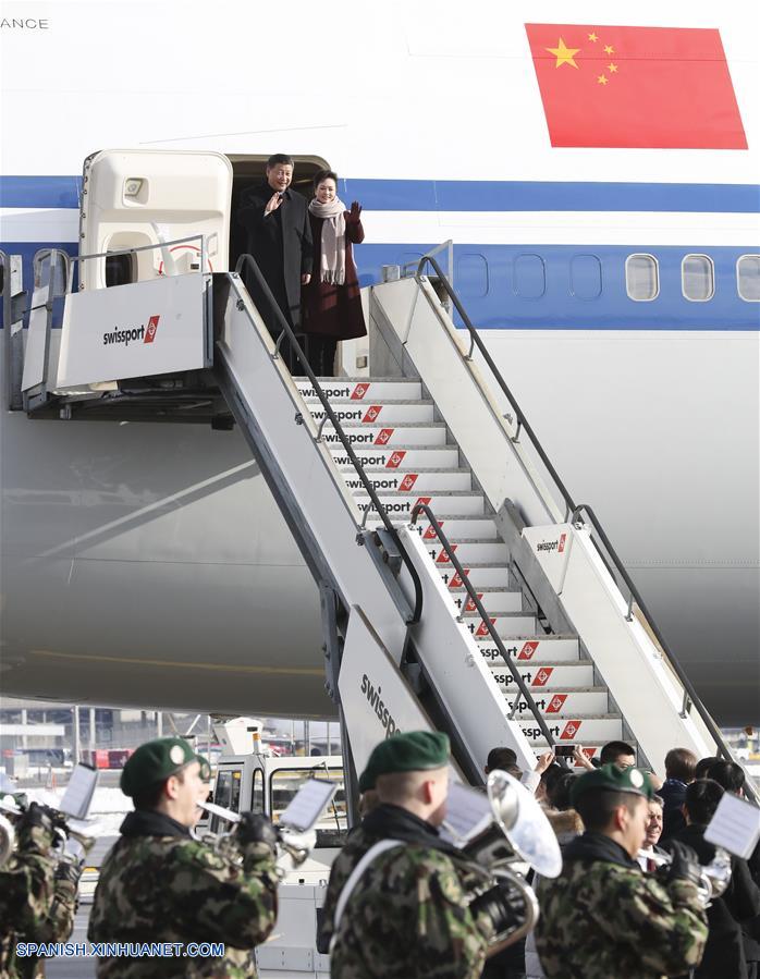 ZURICH, enero 15, 2017 (Xinhua) -- El presidente de China, Xi Jinping, y su esposa, Peng Liyuan, salen del avión a su llegada a Zúrich, Suiza, el 15 de enero de 2017. El presidente chino, Xi Jinping, llegó el domingo a Zúrich para realizar una visita de Estado a Suiza y asistir a la reunión anual 2017 del Foro Económico Mundial (FEM) en Davos. (Xinhua/Ding Lin)