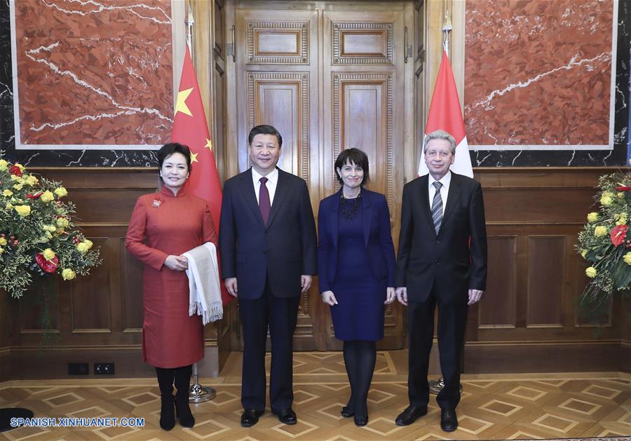 BERNA, enero 15, 2017 (Xinhua) -- El presidente de China, Xi Jinping, asiste a una ceremonia de bienvenida llevada a cabo por todos los miembros del Consejo Federal Suizo, y pronuncia un discurso, en Berna, Suiza, el 15 de enero de 2017. (Xinhua/Lan Hongguang)