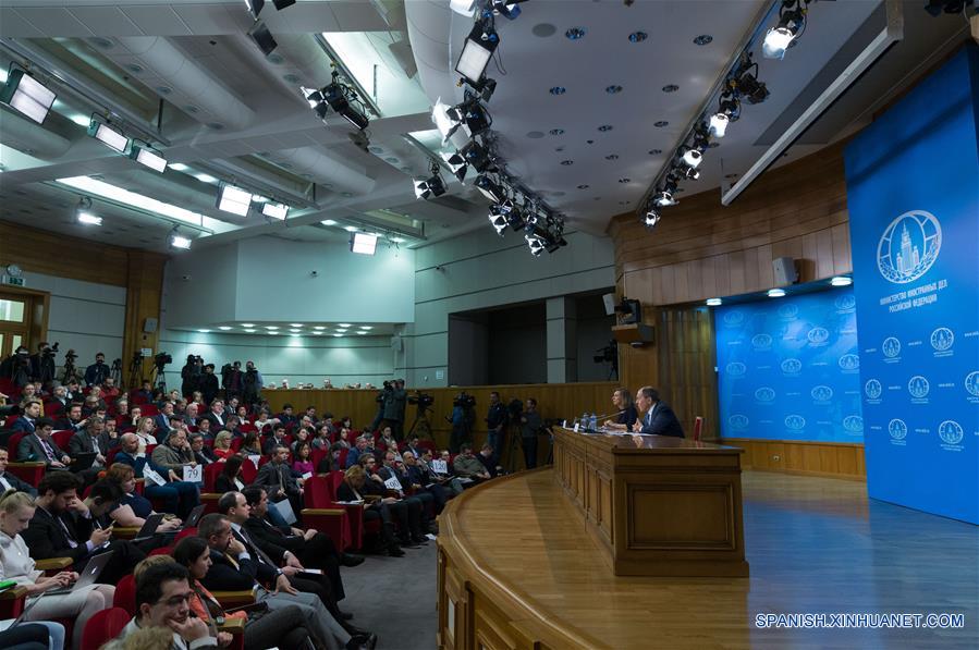 El ministro de Relaciones Exteriores de Rusia, Sergey Lavrov, participa durante su conferencia de prensa anual, en Moscú, Rusia, el 17 de enero de 2017. Moscú consideró apropiado invitar a representantes de la nueva administración de Estados Unidos de América del presidente electo estadounidense, Donald Trump, a las próximas negociaciones intra-Siria en Astana, Kazajistán, dijo el martes el ministro de Relaciones Exteriores ruso, Sergey Lavrov. (Xinhua/Bai Xueqi)