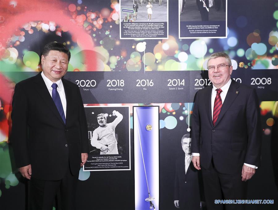 El presidente de China, Xi Jinping, se reunió hoy en Lausana con el presidente del Comité Olímpico Internacional (COI), Thomas Bach. (Xinhua/Lan Hongguang)