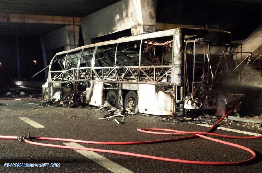VERONA, enero 21, 2017 (Xinhua) -- Imagen tomada con un teléfono móvil del autobús accidentado cerca de Verona, en el norte de Italia, el 21 de enero de 2017. Un total de 16 personas murieron después de que un autobús con estudiantes húngaros a bordo chocase contra una torre de alta tensión y se incendiase en el norte de Italia poco antes de la medianoche, cuando volvían a su país desde una estación de esquí francesa, confirmó el sábado el ministro húngaro de Asuntos Exteriores, Peter Szijjarto. (Xinhua/Str)
