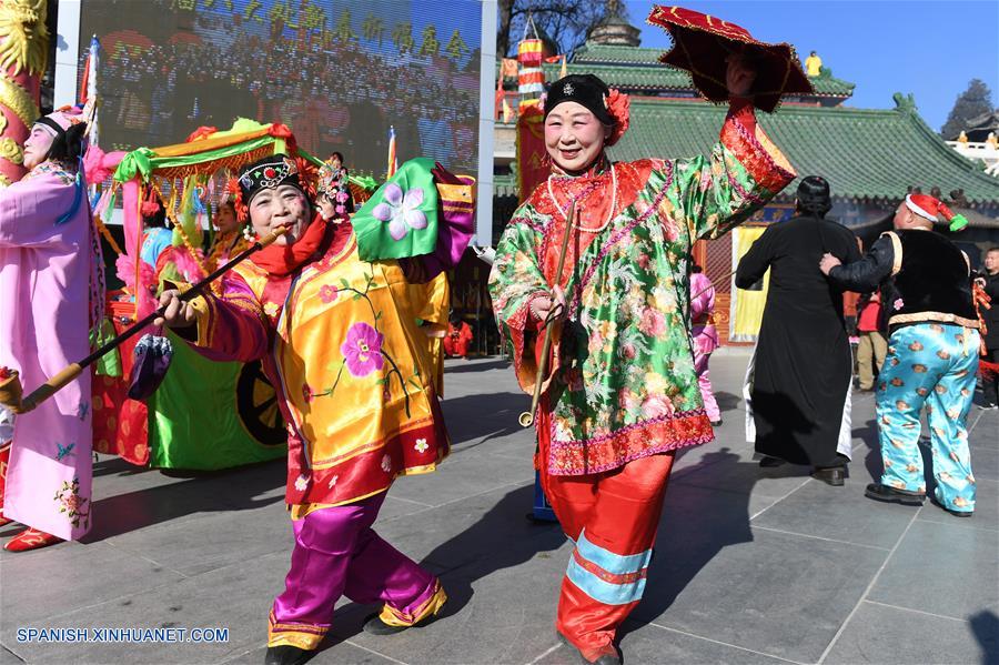 BEIJING, enero 20, 2017 (Xinhua) -- Artistas folclóricos actúan durante un ensayo para una próxima feria del templo, en el Parque Badachu en Beijing, capital de China, el 20 de enero de 2017. La feria del templo comenzará el 28 de enero, el primer día del A?o Nuevo Lunar chino. (Xinhua/Li Jundong)