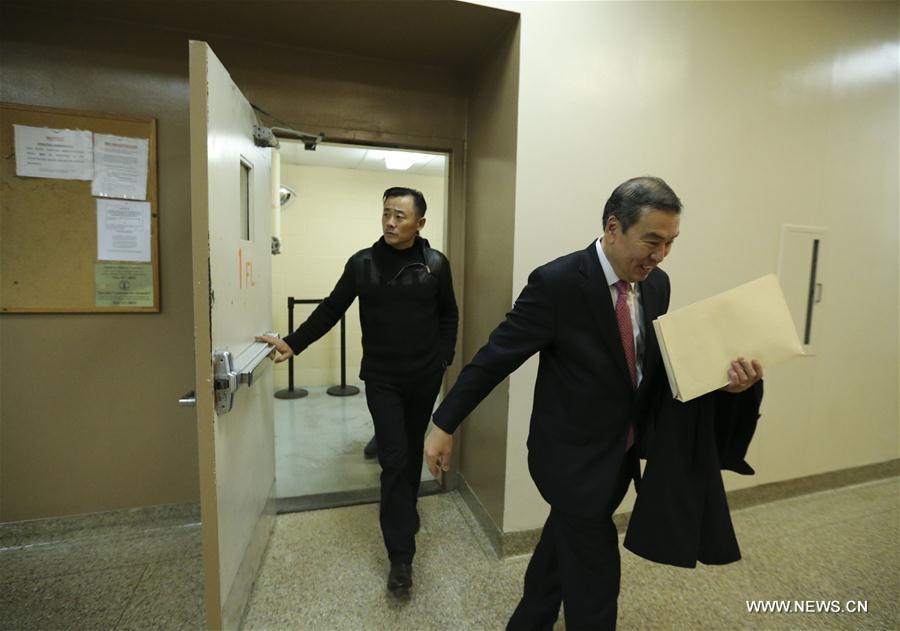 El comediante chino Zhou Libo (centro) y su abogado (izquierda) salen del Tribunal del Distrito Nassau, en Nueva York, después de ser puesto en libertad bajo fianza, en Estados Unidos, el 20 de enero de 2017. El comediante chino Zhou Libo fue detenido en Long Island, Nueva York, por tenencia ilícita arma de fuego y drogas. Zhou, de 49 a?os, y su acompa?ante, Shuang Tang, de 30, están acusados ??de posesión criminal de una sustancia controlada, posesión criminal de un arma y posesión criminal de un arma de fuego, según anunció la policía del condado Nassau en un comunicado de prensa enviado a Xinhua la ma?ana del viernes. Zhou también está acusado de usar el teléfono móvil durante la conducción. (Xinhua / Wang Ying)