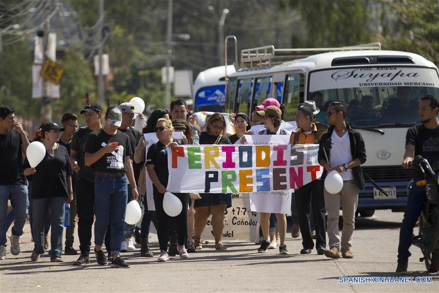 Un grupo de estudiantes de la Universidad Nacional Autónoma de Honduras participa durante una protesta por la muerte de periodistas y comunicadores sociales en Honduras, en Tegucigalpa, capital de Honduras, el 21 de enero de 2017. Desde 2003, unas 69 personas vinculadas a los medios de comunicación han sido asesinadas en el país, según el Comisionado Nacional de Derechos Humanos (CONADEH) de Honduras. (Xinhua/Rafael Ochoa)