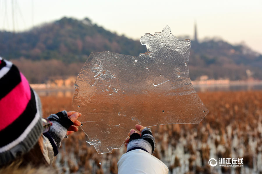 El famoso Lago del Oeste de Hangzhou, en la provincia de Zhejiang, este a?o se congeló por primera vez. La ciudad fue azotada por un frente frío que bajó la temperatura ambiental a 0 grados Celsius, 21 de enero del 2017. (Foto: Zhejiang en Línea)
