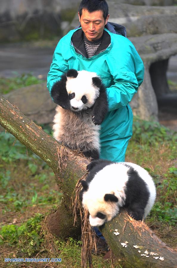 CHONGQING, enero 22, 2017 (Xinhua) -- Los cachorros gemelos de panda gigante Dashuang (arriba) y Xiaoshuang (abajo), juegan en el Zoológico de Chongqing, en Chongqing, en el suroeste de China, el 22 de enero de 2017. Los cachorros gemelos, nacidos en julio de 2016, conocieron al público el domingo. (Xinhua/Chen Cheng)