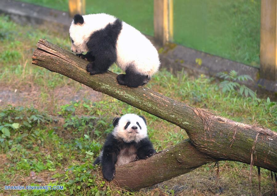 CHONGQING, enero 22, 2017 (Xinhua) -- Los cachorros gemelos de panda gigante Dashuang (arriba) y Xiaoshuang (abajo), juegan en el Zoológico de Chongqing, en Chongqing, en el suroeste de China, el 22 de enero de 2017. Los cachorros gemelos, nacidos en julio de 2016, conocieron al público el domingo. (Xinhua/Chen Cheng)
