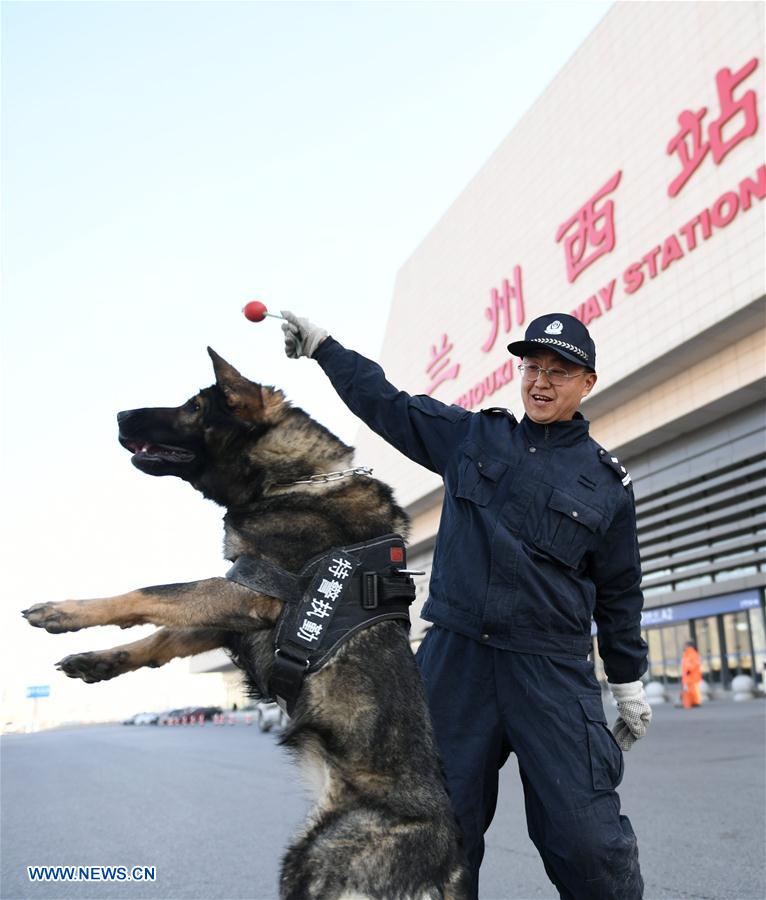 El entrenador Zhang Hongtao instruye a la perra policía Lulu, experta en detección de sustancias prohibidas, asignada al puesto de control de seguridad de la estación de tren Lanzhouxi en Lanzhou, capital de la provincia de Gansu, el 22 de enero del 2017. Muchos perros policía estarán de servicio durante la oleada de viajes interprovinciales e internacionales motivados por las vacaciones de invierno del A?o Nuevo Chino. (Foto: Chen Bin)