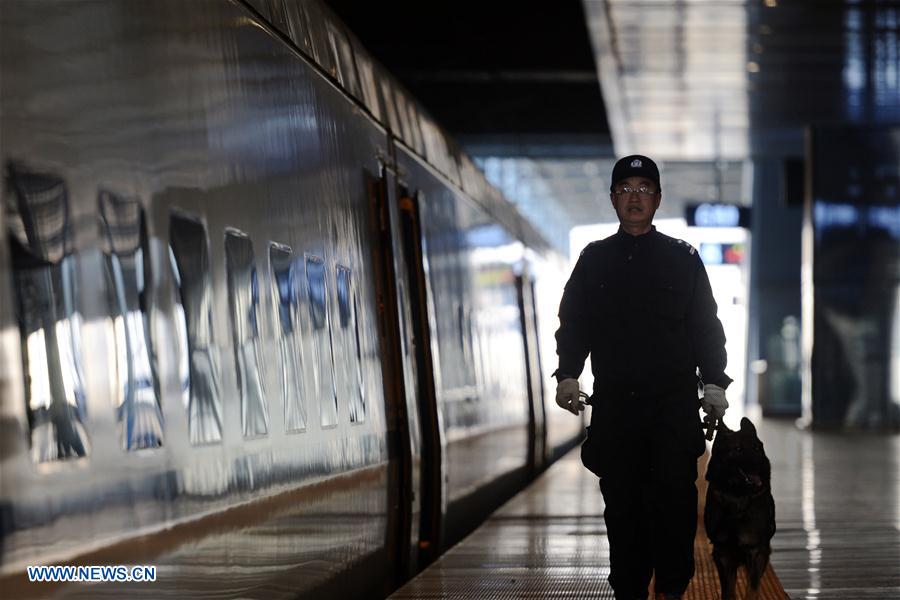 El entrenador Zhang Hongtao patrulla junto a la perra policía Lulu, experta en detección de sustancias prohibidas, asignada al puesto de control de seguridad de la estación de tren Lanzhouxi en Lanzhou, capital de la provincia de Gansu, el 22 de enero del 2017. Muchos perros policía estarán de servicio durante la oleada de viajes interprovinciales e internacionales motivados por las vacaciones de invierno del A?o Nuevo Chino. (Foto: Chen Bin)