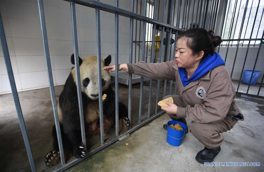 La cuidadora Liu Yi alimenta a un panda gigante en la base de Dujiangyan del Centro de Conservación e Investigación para el Panda Gigante de China, en la provincia de Sichuan, en el suroeste de China, el 27 de enero de 2017. Los empleados siguen trabajando en el centro para cuidar de los pandas gigantes durante las vacaciones del Festival de Primavera. (Xinhua/Xue Yubin)