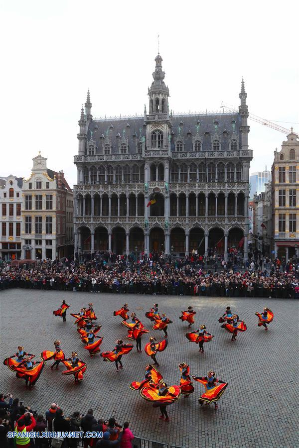 BRUSELAS, enero 28, 2017 (Xinhua) -- Bailarines participan durante el Desfile del A?o Nuevo Lunar chino en el centro de Bruselas, Bélgica, el 28 de enero de 2017. (Xinhua/Gong Bing)