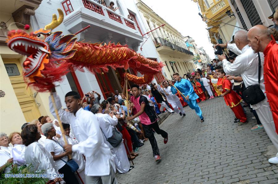 LA HABANA, enero 28, 2017 (Xinhua) -- Una danza del dragón es interpretada durante el espectáculo de bienvenida al A?o Nuevo Lunar chino a cargo de la Escuela Cubana de Wushu, en el Barrio Chino en La Habana, Cuba, el 28 de enero de 2017. El Festival de Primavera o A?o Nuevo Lunar chino, se celebra el 28 de enero este a?o. (Xinhua/Joaquín Hernández)