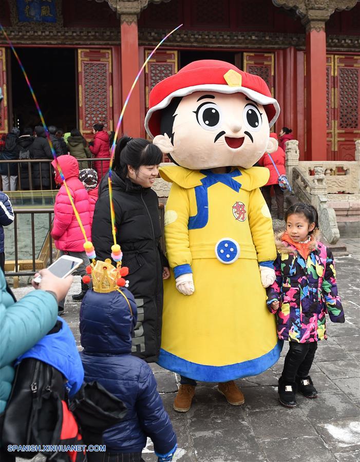 LIAONING, enero 28, 2017 (Xinhua) -- Turistas posan con un personaje de dibujos animados en el Museo del Palacio de Shenyang, en Shenyang, capital de la provincia de Liaoning, en el noreste de China, el 28 de enero de 2017. De acuerdo con datos de la Administración Nacional de Turismo de China, del sábado, el número de turistas recibidos en China alcanzó los 65.2 millones, generando ingresos totales por un valor de 76,000 millones de yuanes (aproximadamente 11,100 millones de dólares estadounidenses). (Xinhua/Li Gang)