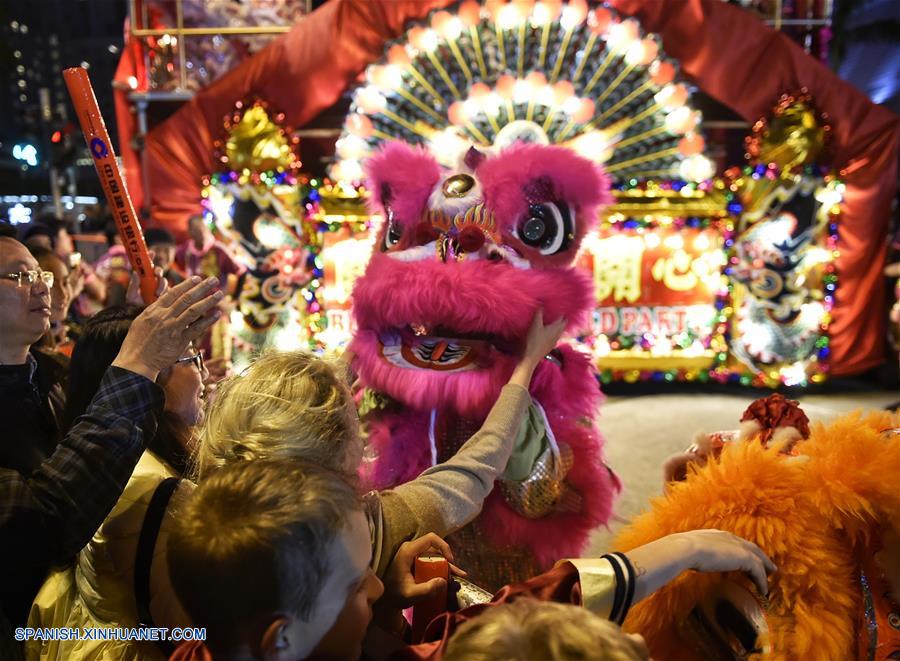 HONG KONG, enero 28, 2017 (Xinhua) -- Personas tocan a un danzante del león durante el Desfile Internacional de la Noche del A?o Nuevo Chino de Cathay Pacific, en Hong Kong, en el sur de China, el 28 de enero de 2017. (Xinhua/Wang Shen)