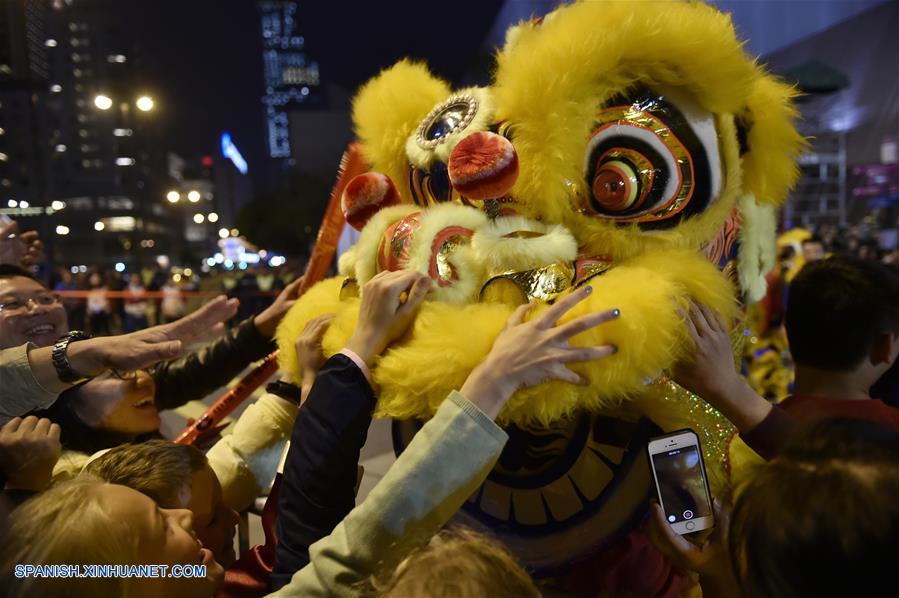 HONG KONG, enero 28, 2017 (Xinhua) -- Personas tocan a un danzante del león durante el Desfile Internacional de la Noche del A?o Nuevo Chino de Cathay Pacific, en Hong Kong, en el sur de China, el 28 de enero de 2017. (Xinhua/Wang Shen)