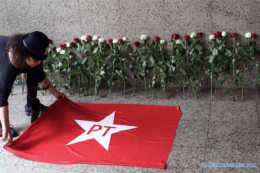 Una simpatizante coloca una bandera del Partido del Trabajo a la entrada del Hospital Sirio-Libanés, donde la ex primera dama de Brasil, Marisa Leticia Lula da Silva, fue hospitalizada, en Sao Paulo, Brasil, el 2 de febrero de 2017. La ex primera dama de Brasil, Marisa Leticia Lula da Silva, dejó de tener flujo cerebral, de acuerdo a un informe divulgado el jueves por el Hospital Sirio-Libanés de Sao Paulo, donde se encuentra internada desde el 24 de enero. El boletín médico informó que un doppler trancraneano identificó la ausencia de flujo sanguíneo cerebral. El ex presidente brasile?o, Luiz Inácio Lula da Silva, informó a través de su cuenta en redes sociales que la familia ya autorizó la donación de órganos. (Xinhua/Rahel Patrasso)