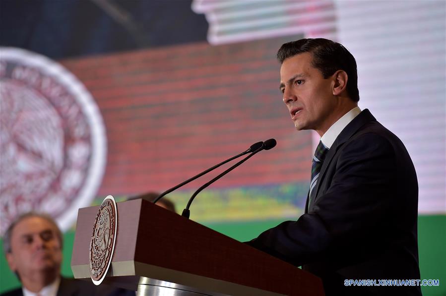Imagen cedida por la Presidencia de México del presidente mexicano Enrique Pe?a Nieto, pronunciando un discurso durante la clausura de la XXXIII Asamblea General Ordinaria del Consejo Nacional Agropecuario (CNA), en la Ciudad de México, capital de México, el 2 de febrero de 2017. Durante el evento, Enrique Pe?a Nieto aseguró que su país renegociará el Tratado de Libre Comercio de América del Norte (TLCAN) con apego a las formas diplomáticas y exigiendo respeto para la nación. (Xinhua/Presidencia de México)