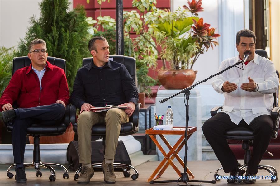 CARACAS, febrero 2, 2017 (Xinhua) --El presidente de Venezuela, Nicolás Maduro (d), acompa?ado por el vicepresidente venezolano, Tareck El Aissami (c), y el ministro de Educación, Elías Jaua (i), participan en un acto en conmemoración de los 18 a?os de la llegada de Hugo Chávez a la presidencia, en Caracas, Venezuela, el 2 de febrero de 2017. De acuerdo con información de la prensa local, durante el evento Maduro destacó los esfuerzos de Chávez para construir una democracia con la participación protagónica del pueblo. (Xinhua/Boris Vergara)