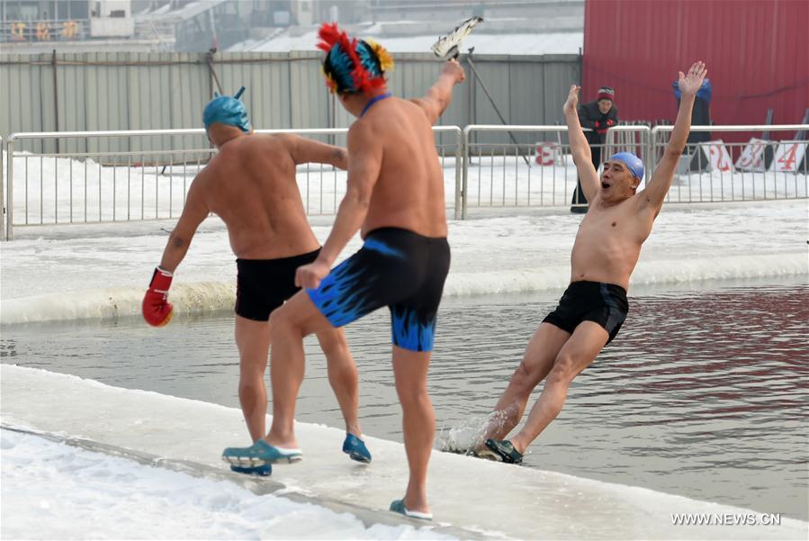 Tres nadadores de invierno practican boxeo sobre hielo en Harbin, capital de la provincia de Heilongjiang, el 4 de febrero de 2017. [Foto / Xinhua]