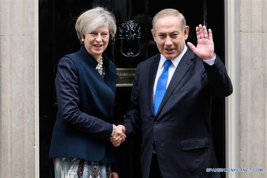 LONDRES, febrero 6, 2017 (Xinhua) -- La primera ministra británica, Theresa May (i), estrecha la mano del primer ministro de Israel, Benjamin Netanyahu (d), previo a su reunión en el número 10 de la Calle Downing, en Londres, Reino Unido, el 6 de febrero de 2017. (Xinhua/Ray Tang)