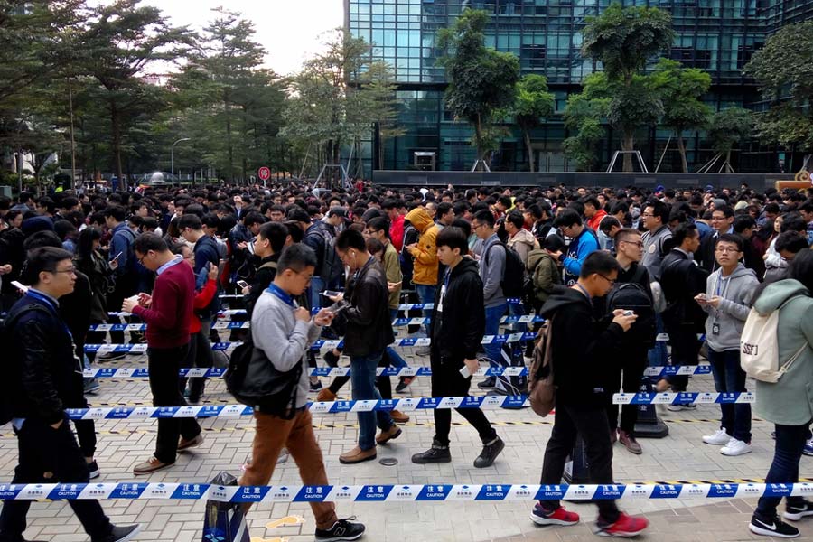 Empleados de Tencent aguardanpara obtener su sobre rojo (hongbao), Shenzhen, provincia de Guangdong. [Foto: VCG]