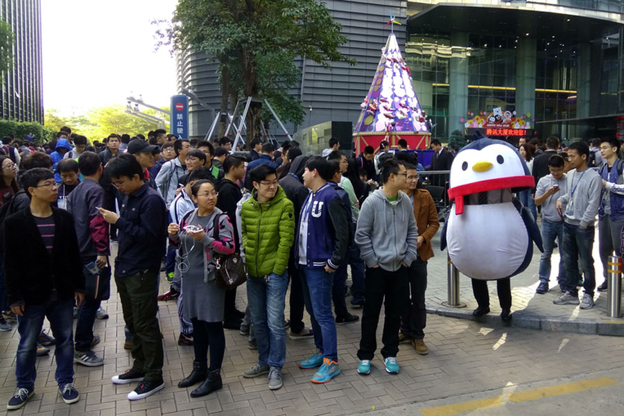 Empleados de Tencent aguardan para obtener su sobre rojo (hongbao), Shenzhen, provincia de Guangdong. [Foto: VCG]